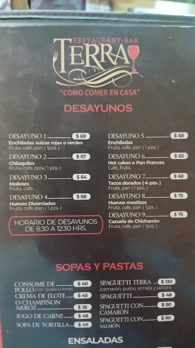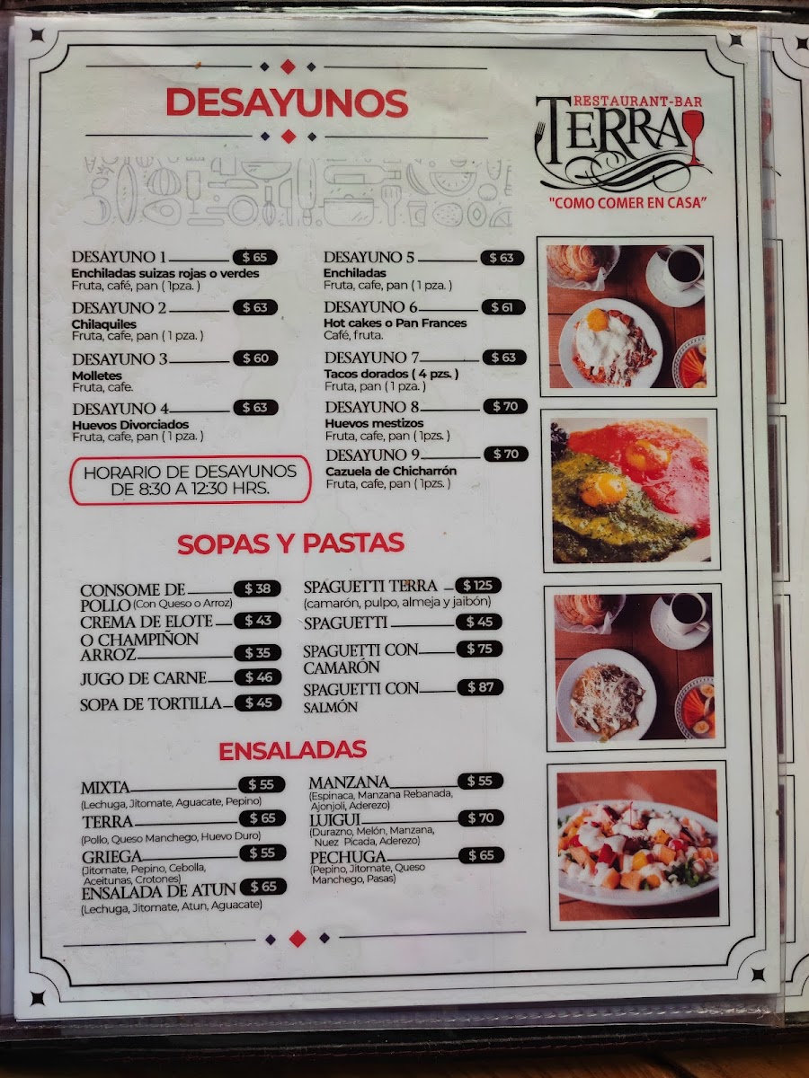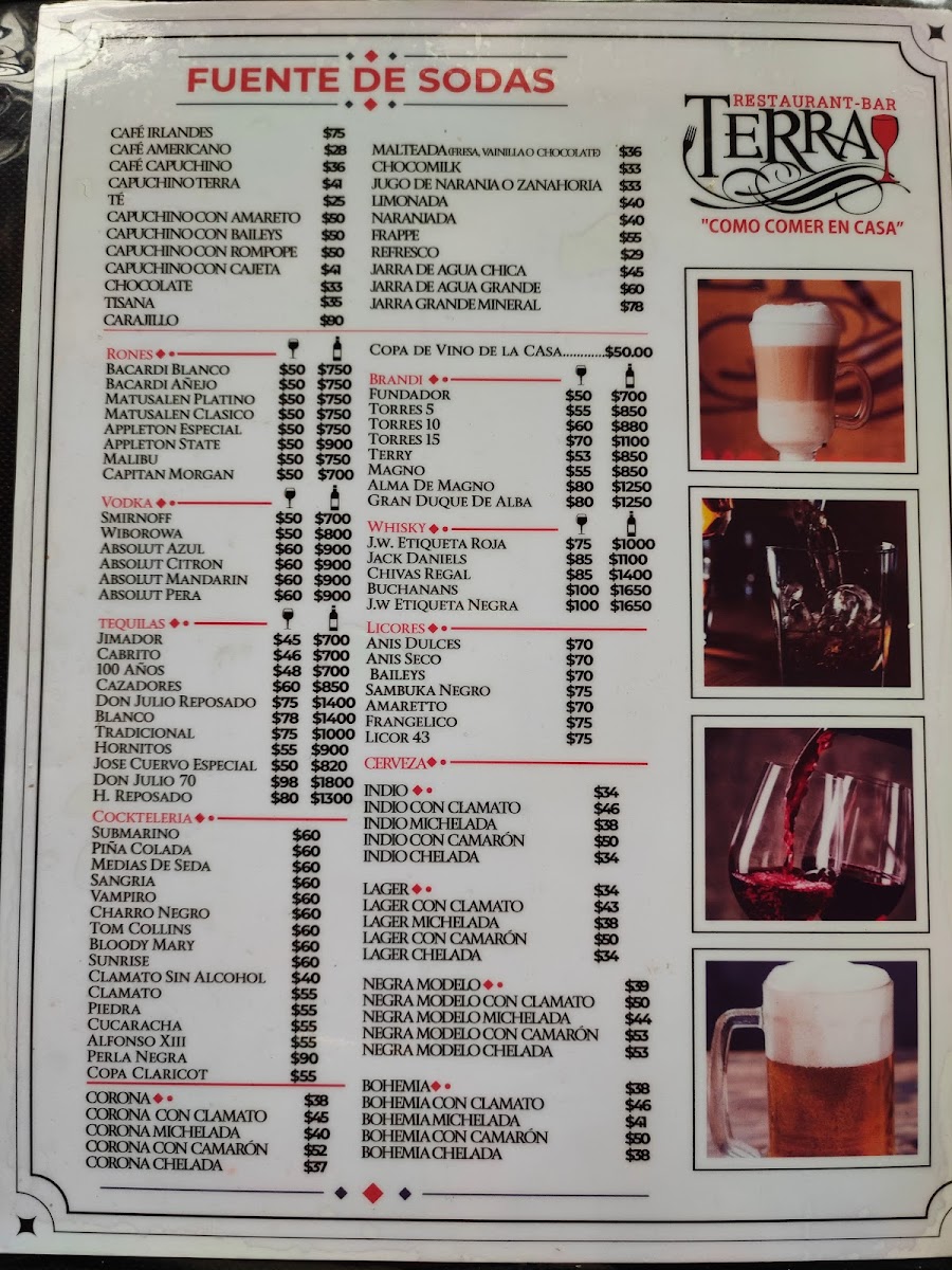 The menu at Restaurant Bar Terra offers a variety of dishes and beverages suited for different dining occasions, including breakfast, casual meals, and light snacks. The selection features traditional Mexican specialties alongside grilled meats and fresh seafood options.
