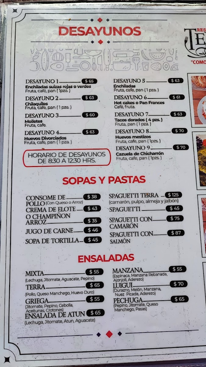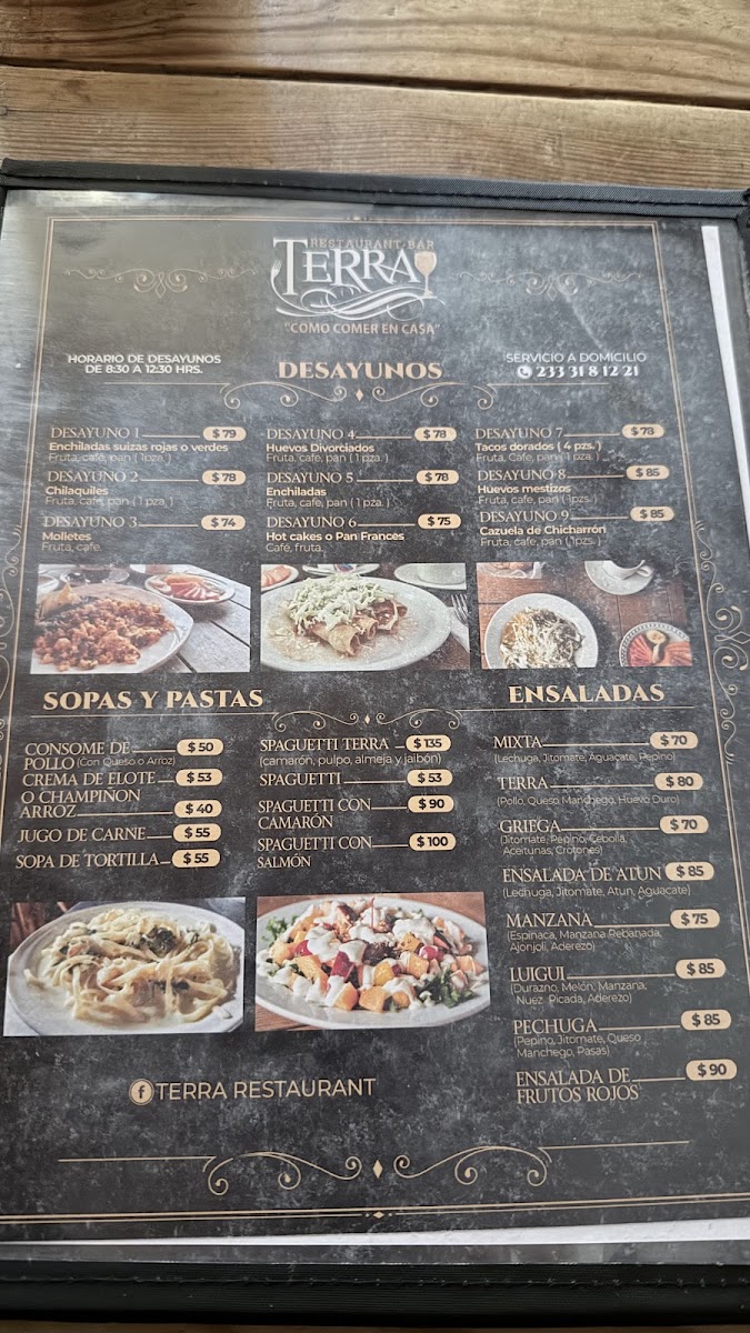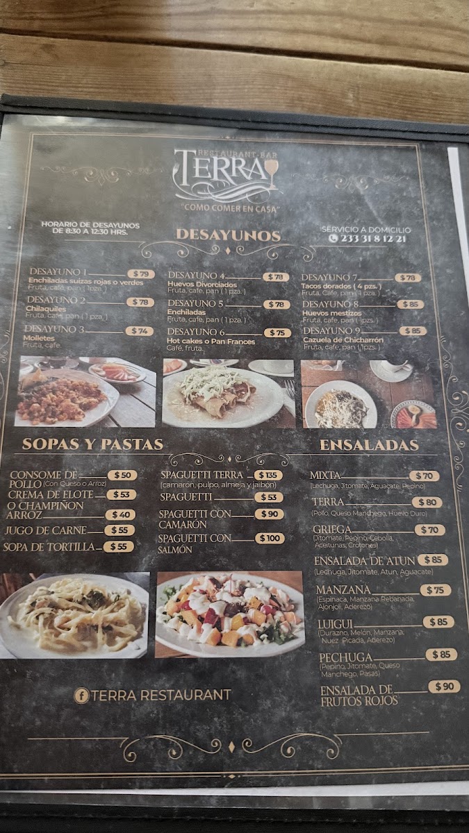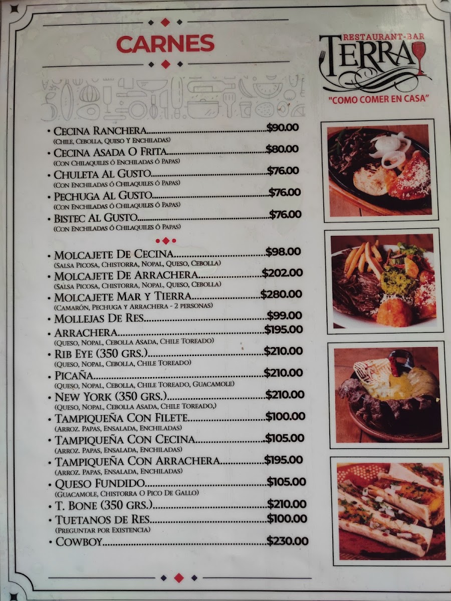 The menu at Restaurant Bar Terra offers a variety of dishes and beverages suited for different dining occasions, including breakfast, casual meals, and light snacks. The selection features traditional Mexican specialties alongside grilled meats and fresh seafood options.